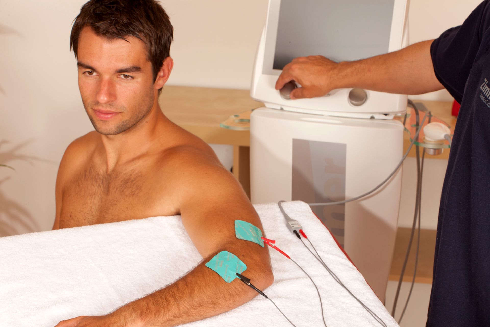 In der Elektrotherapie werden Elektroden am Körper angelegt. Verschieden geformte Impulse fließen durch das Gewebe.
